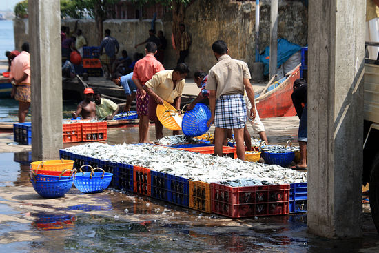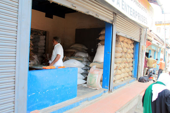 Jetzt wollte ich mit der Fähre von Mattencherry aus zurück, musste aber feststellen, dass erst in 1,5 Stunden wieder eine Fähre eintrifft. Das dauert mir zu lange. Sop bin ich die Inselstraße "oben herum" zur Fähranlegestelle "Fort Cochin" gelaufen. Auf diesem Stück ist von Tourismus noch nichts zu spüren. Reisgroßhändler und andere Gewerbe bestimmen das Bild. Das merkt man auch gleich an den nicht renovierten Gebäuden. Von Fort Cochin fahren viel mehr und vor allem regelmäßiger Fähren ab.