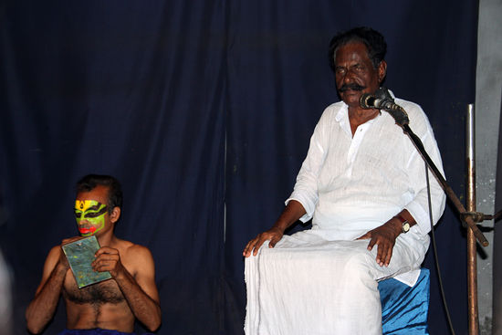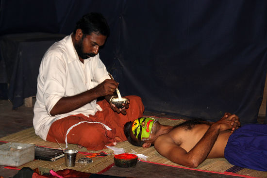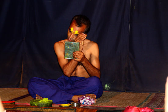 Gegen 17:45 war ich beim "I see India ". So hatte mir der Mann am Helpdesk aufgeschrieben gehabt. Es war aber noch alles verriegelt. Erst ab 18:00 wird zur Schminkprozedur geöffnet. Wie im Know-How beschrieben, erklärt Devdas, der Chef der Company seeeehr ausgiebig, so dass ein Norweger neben mir eingeschlafen ist. Bei etwas Interesse, waren die Erläuterungen aber wirklich interessant. Nur das Verhältnis von Schmink- zu Tanzvorführung fand ich nicht ganz angemessen.
