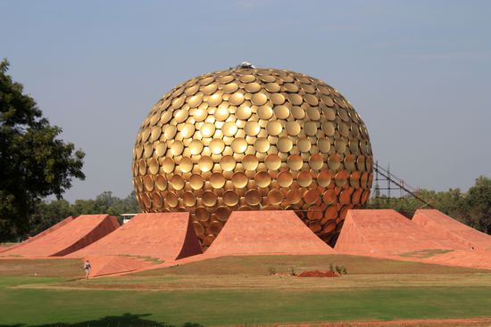 Von hier aus ging es wieder aus der Stadt in das 14 Kilometer entfernte Auroville, dem Projekt der Gefährtin Aurobindos. Hier sollen Menschen aus allen Nationen, mit allen Glaubensrichtungen etc frei und in Frieden zusammen leben. Den Mittelpunkt der Anlage bildet eine Goldene Kugel, die offiziell aber von Touristen nicht betreten werden darf, weil es ein "Raum der Andacht und Konzentration" ist. Hier drin soll eine Glaskugel sein, die das von oben einfallende Licht bricht und die von der deutschen Firma Zeiss gebaut worden ist. Wir mussten uns aber mit einem Blick aus der Ferne vom offiziellen Aussichtspunkt aus begnügen. Um da hin zu kommen, mussten wir erst ein 10minütiges salbungsvolles Video über uns ergehen lassen und dann einen Kilometer weit laufen. Nur Alte und Gehbehinderte werden das größte Stück gefahren.