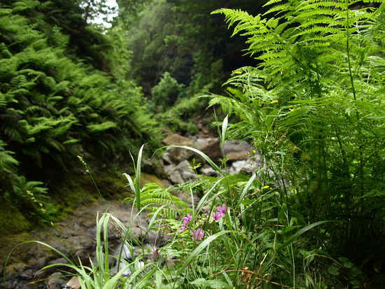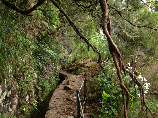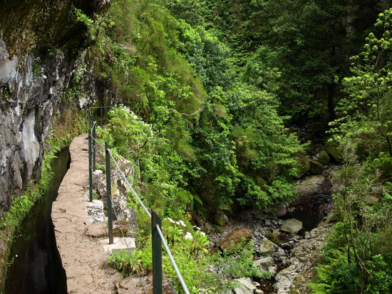 Die Insel fordert weiteren Blutzoll. Es geht nach Santana, auf die Nordseite. Die strohgedeckten Häuser zu besichtigen schenken wir uns - es fehlt das Licht, denn es ist stark bewölkt. Von dort fahren wir auf 900 Meter hinauf, wo wir das Auto parken. Die Luft ist kühl, neblig, kleine Tropfen sprühen durch die Luft. Lange Hosen und Jacke machen sich hier bezahlt. An diesem Ort beginnt eine der verwunschensten Levadas zum "Caldeirao Verde", dem grünen Kessel, mit einer Weglänge von etwa 13 Kilometern. Mir scheint, diese Natur vertrüge gar keine Sonne, sonst ginge ihr geheimnisvoller Zauber verloren. Es grünt üppig, und hätte es 15 Grad mehr, würde man sich in einem tropischen Regenwald wähnen. Wir müssen durch vier Tunnel gehen; zwei davon haben es in sich: stockfinster, schlüpfriger Boden, herabhängende Felszapfen. Weil ich mich besonders langsam vorantaste, dreht sich Urban immer wieder nach mir um und leuchtet mit der Taschenlampe. Dabei übersieht er das, was von der Decke herunterhängt.