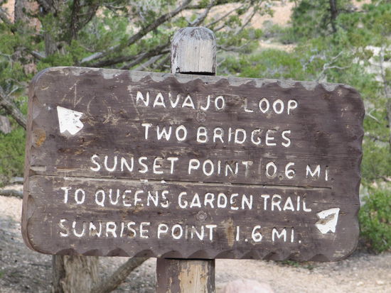 Um 11 Uhr machten wir uns dann zu Fuß auf den Weg zum Sunset Point, um ab hier den Navajo Loop nach unten zu wandern. Der Abstieg war ziemlich steil und ich heilfroh, dass der Aufstieg später am Sunrise Point einfacher sein soll. Wir liefen durch die sogenannte Wall Street und bewunderten die Hoodoos. Hoodoos werden die Steinsäulen genannt, die über die Zeit von Wind und Wetter geformt wurden und das Wahrzeichen des Nationalparks sind. Am Abzweig zweier Trails gingen wir auf dem Queens Garden Trail weiter und kamen dann nach einer Weile zum Queens Garden und der dort stehenden "Queen Victoria". Mit viel Fantasie soll der dort stehende Hoodoo aussehen, wie die ehemalige Königin von England. Die Wanderwege hier im Bryce Canyon sind sehr schön angelegt, es lässt sich schön laufen, man kann die Natur bewundern und wunderbar abschalten. Nach unser zweistündigen Wanderung gingen wir zurück auf unser Zimmer und faulenzten noch ein bisschen.
