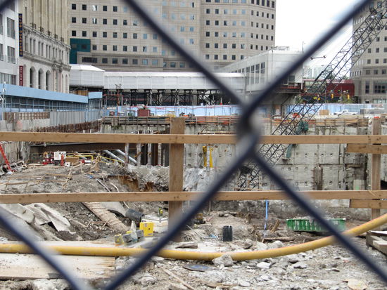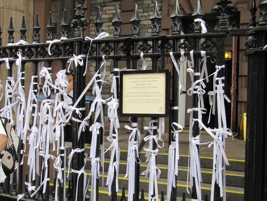 Ausgeruht und frisch gestärkt liefen wir zur St. Paul's Chapel, die gleich um die Ecke lag. Dort waren aufgrund dem morgigen Jahrestag des 9/11 schon viele Reporter mit ihren Kamerateams. An verschiedenen Stände wurden kleine Schleifchen, zum Gedenken an das schreckliche Ereignis vor 10 Jahren, verkauft. Die Leute banden diese Schleifen dann rund um die Kirche an die Zäune und vermerkten auch immer einen eigenen Gedanken neben dem Standardspruch. Es war schon eine seltsame Stimmung rund um die Kirche. Viele Feuerwehrleute und andere Offiziere liefen in ihren Uniformen herum, Geistliche schüttelten hinter der Kirche den Leuten die Hand, über all waren schon Straßen abgesperrt und die Polizei an jeder Ecke präsent. Wenige Schritte weiter standen wir dann auch schon am Ground Zero. Eine riesige Baustelle und mitten drin schon etliche Stockwerke vom neuen One World Trade Center, der am Ende 1776 ft (541 m) hoch sein soll, da diese Zahl das Gründungsjahr der USA verkörpert.