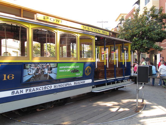 Frisch gestärkt machten wir uns auf den Weg zum Coit Tower. Im Internet hatte ich ausfindig gemacht, dass man diesen über die Filbert Steps erreichen kann. Das sind Treppen, die direkt an Privathäusern und durch grünes Dickicht hinauf zum Turm führen. Oben am Fuß des Turmes angekommen, genossen wir erst von hier die Aussicht und verschnauften etwas. Doch da wir schon mal hier waren, investierten wir auch noch die paar Dollar, um von oben einen Blick auf die Stadt zu erhaschen. Man konnte eigentlich alles sehen, nur die Golden Gate Bridge lag immer noch im dicken Kleid aus Nebel. Wieder unten angekommen, liefen wir zu Fuß über die Columbus Avenue zurück ins Hotel, um den weiteren Schlachtplan zu besprechen. Auf dem Weg zum Hotel sind wir noch am Wendepunkt der Cable Cars vorbeigekommen. Bis jetzt sind wir noch mit keinem gefahren, aber das werden wir auf jeden Fall nachholen.