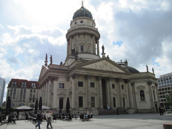 Um die Zeit bis zur Abreise noch etwas zu nutzen, besichtigten wir als letztes noch den Gendarmenmarkt, der oft als Berlins schönster Platz bezeichnet wird. In der Mitte befindet sich das von Karl-Friedrich Schinkel erbaute klassizistische Schauspielhaus, eines seiner Hauptwerke, das total zerstört war, und wiedererbaut, 1984 als Konzerthaus eröffnet wurde. Zu beiden Seiten des Schauspielhauses stehen die Französische Kirche und die Deutsche Kirche, auch Französischer und Deutscher Dom genannt. Die Französische Kirche wurde 1701-05 für die Hugenotten erbaut und enthält auch deren spezielles Museum. Die Deutsche Kirche wurde 1701-08 erbaut und als genaues Gegenstück der Französischen Kirche gestaltet, insbesondere durch die 1780-85 von C. V. Gontard erbauten bekuppelten gleichen Türme. Hier ließen wir uns auf einer Bank von den letzten Sonnenstrahlen kitzeln, bevor wir unsere Koffer im Hotel abholten.