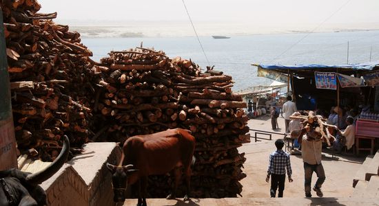An zwei Ghats finden die Leichenverbrennungen statt - am Marnikarnika-Ghat kann man das alles aus der Nähe betrachten. Fotoverbot aus Respekt vor den Toten. Die Leichen sind in Tücher gehüllt - sehr reiche Leute lassen sich mit Sandelholz verbrennen, das ein Vielfaches kostet. Nur Personen, die eines natürlichen Todes gestorben sind, dürfen sich an diesem Ghat verbrennen lassen - Kinder, Schwangere und Sadhus werden gar nicht verbrannt. Diese Leichen werden nur in Tücher gehüllt und mit Steinen beschwert im Ganges versenkt. Da der Wind heute sehr günstig für uns als Besucher geweht hat, waren wir von evtl. unangenehmen Gerüchen verschont. Hinter und neben diesem Ghat, Holzstapel über Holzstapel. Fortdauernd wurden Holzscheite auf den Schultern zu dem Ghat getragen. Das war wirklich recht interessant und in keinster Weise ekelerregend oder abstoßend - einfach ein natürlicher Abschied vom Leben. Wenn man in dieser Stadt stirbt, kommt man direkt in den Himmel - ohne Wiedergeburt. Daher kommen auch viele Gläubige mit Sterbenden in diesen Ort, um ihnen so den Weg ohne Reinkarnation zu ermöglichen.