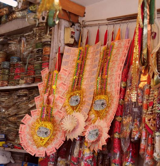 Erst als wir die Läden der "normalen" Bewohner erreicht hatten, kehrte Ruhe ein. Hier wurde mal wieder alles angeboten, Nudeln in allen Formen und Farben, Bethelnüsse, Gewürze, Sugar-Candy (sieht aus wie alter Käse in Laiben, aber schmeckt gut). Hier gibt es tatsächlich auch Läden, in denen Geldscheine zu kunstvollen Gebilden zusammen getackert und mit Glitzerbändern als Geschenk zum Kauf angeboten werden.