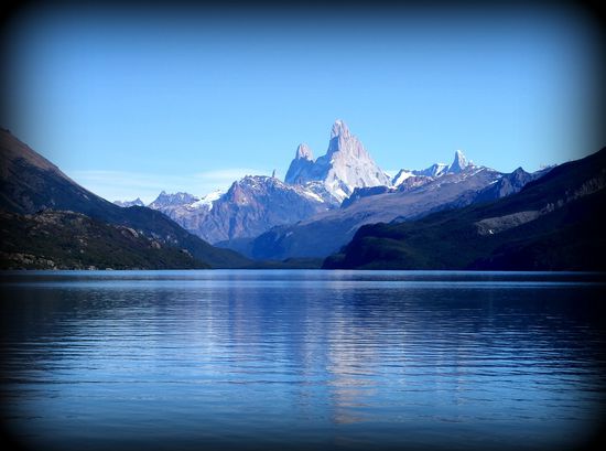 Die Landstrasse bestand aus Steinen und Kiesel, war jedoch einfach zu belaufen. Irgendwann kamen wir an ein Paneau auf welchem der Grenzübertritt vom chilenischen zum argentinischen Land angezeigt wurde. Prompt war die Landstrasse vorbei und man lief auf einem dünnen Wanderweg in den Wald hinein. Ab hier schien es für die Fahrradfahrer schwierig zu werden. Es war ein schmaler Pfad, teilweise in einer Grube, mit vielen Wurzeln, Schlamm und Steinen welche man herunterhüpfen musste. Wir waren für einmal froh zu Fuss unterwegs zu sein. Wir kamen von oben hergelaufen und sahen urplötzlich auf das Tal vor uns herab. Der wunderschöne blaue Lago Desierte erstreckte sich vor uns mit dem Berg Fitz Roy im Hintergrund.