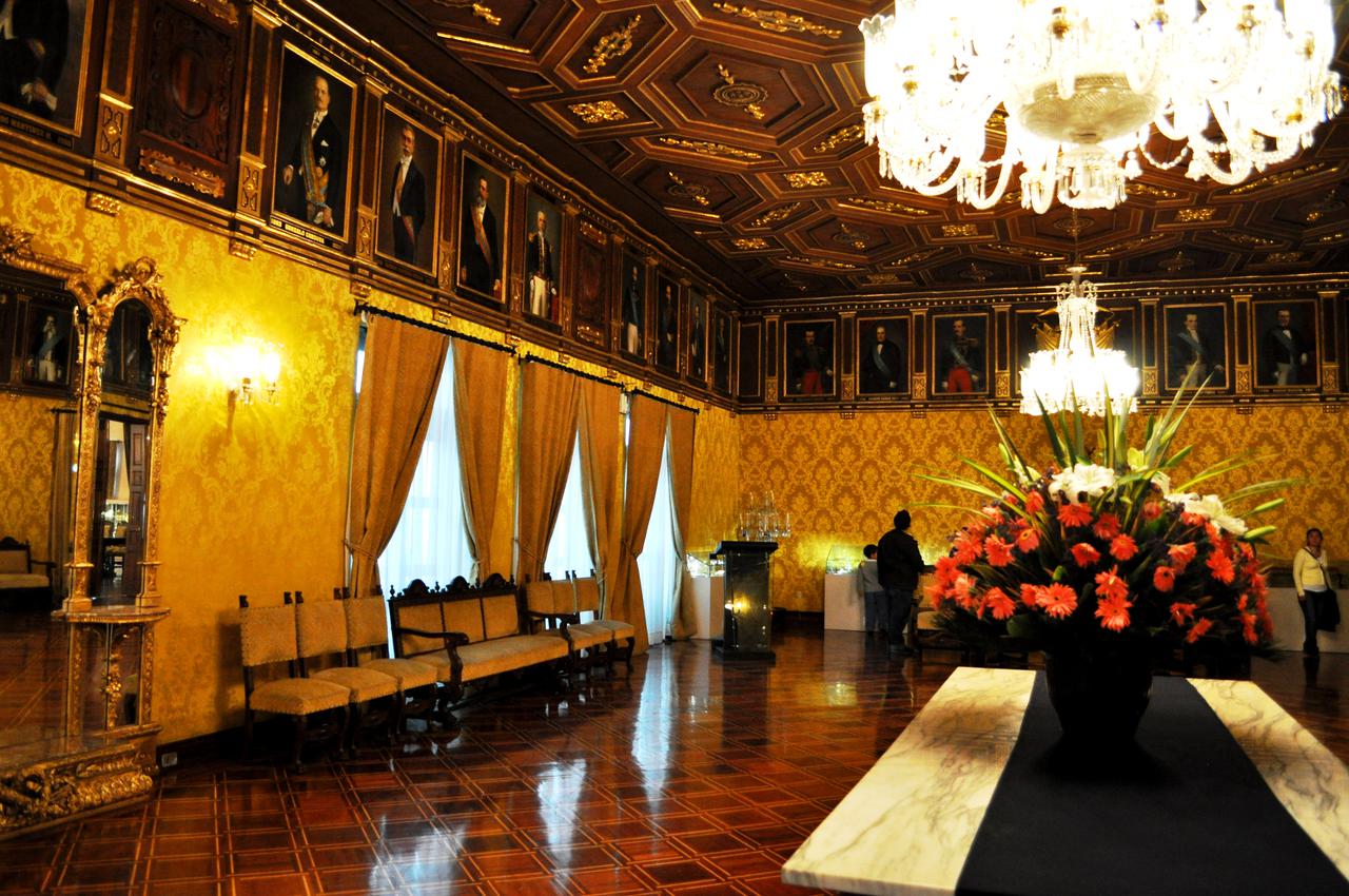 Beim Palast warteten wir 10 Minuten bis uns Eintritt gewährt wurde. Als erstes mussten wir unsere Passkopie abgeben, woraufhin wir einen Besucherpatch erhielten, unser Gepäck gescannt wurde und wir durch einen Metalldedektor laufen mussten. Die Kontrollen werden aber wohl nicht sonderlich streng durchgeführt. Obwohl es bei mir gepiepst hatte, zuckte niemand mit der Wimper. Danach mussten wir für ein Foto posieren, welches wir am Schluss geschenkt bekamen. Unser Guide, der Spanisch, Englisch, Französisch und Chinesisch sprach, führte unsere Gruppe durch das Gebäude. Wir sahen ein Mosaikgemälde vom berühmten Künstler Guyasamin, das Sitzungszimmer, ein Eventraum, die Terrasse, das Arbeitszimmer des Präsidenten und eine Ecke wo gebetet, getrunken und geraucht wird. Der Guide führte die Besichtigung extrem sympathisch, witzig und spannend durch. Nach ca. einer Stunde verliessen wir den Palast wieder. In der Zwischenzeit hatte es leicht angefangen zu regnen. Wir entschlossen uns zum Busterminal zurück zu laufen und nach Hause zu fahren.