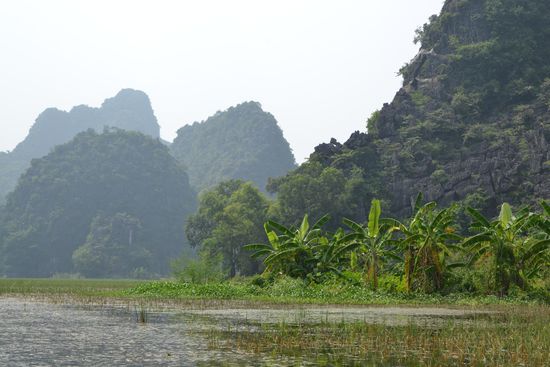 Gestern fuehrte uns unser Weg Richtung Sueden. In Ninh Binh gibt es ein weiteres beeindruckendes Naturschauspiel: die sogenannte trockene Halong Bucht. So trocken war sie gar nicht. Zuerst besichtigten wir aber eine weitere Pagode und den Ort Ninh Binh. Danach ging es mit dem Bus weiter aufs Land hinaus. Die trockene Halong Bucht ist wirklich mindestens genauso schoen wie die Halong Bucht an der Kueste des Suedchinesischen Meeres. Die Karstfelsen ragen bis zu 100 Meter aus den Reisfeldern. Das kraeftige Gruen des Reises und die tropische unberuehrte Natur ist wirklich einmalig. Wir fuhren durch die Gewaesser mit einem Boot und staunten wirklich ueber diesen faszinierenden Ort. Allerdings hatten wir abermals mit der Hitze zu kaempfen. So an die 36 Grad im Schatten werden es schon wieder gewesen sein. Das klingt jetzt nicht so viel, und wir haben das auch manchmal in Europa, aber die 100 Prozent Luftfeuchtigkeit machen jede Bewegung zu einer Tortur. Ich denke ich, und auch Katrin, hatten bis jetzt keine Minute ausserhalb des Zimmers wo wir nicht klatschnass waren. Bis jetzt hat es weiterhin keinen Tropfen geregnet, sehr sehr ungewoehnlich fuer diese Jahreszeit wie uns auch alle Anderen bestaetigen. ICh glaube insgeheim wuenschen wir uns schon ein bisschen Regen und hoffen dass dieser ein bisschen Abkuehlung mit sich bringt. Mittlerweile haben wir viele Freunde hier gefunden, wir trafen Leute von ueberall auf der Welt: Kanada, Israel, USA, Australien, Tschechien, Deutschland... Wirklich eine tolle Erfahrung.