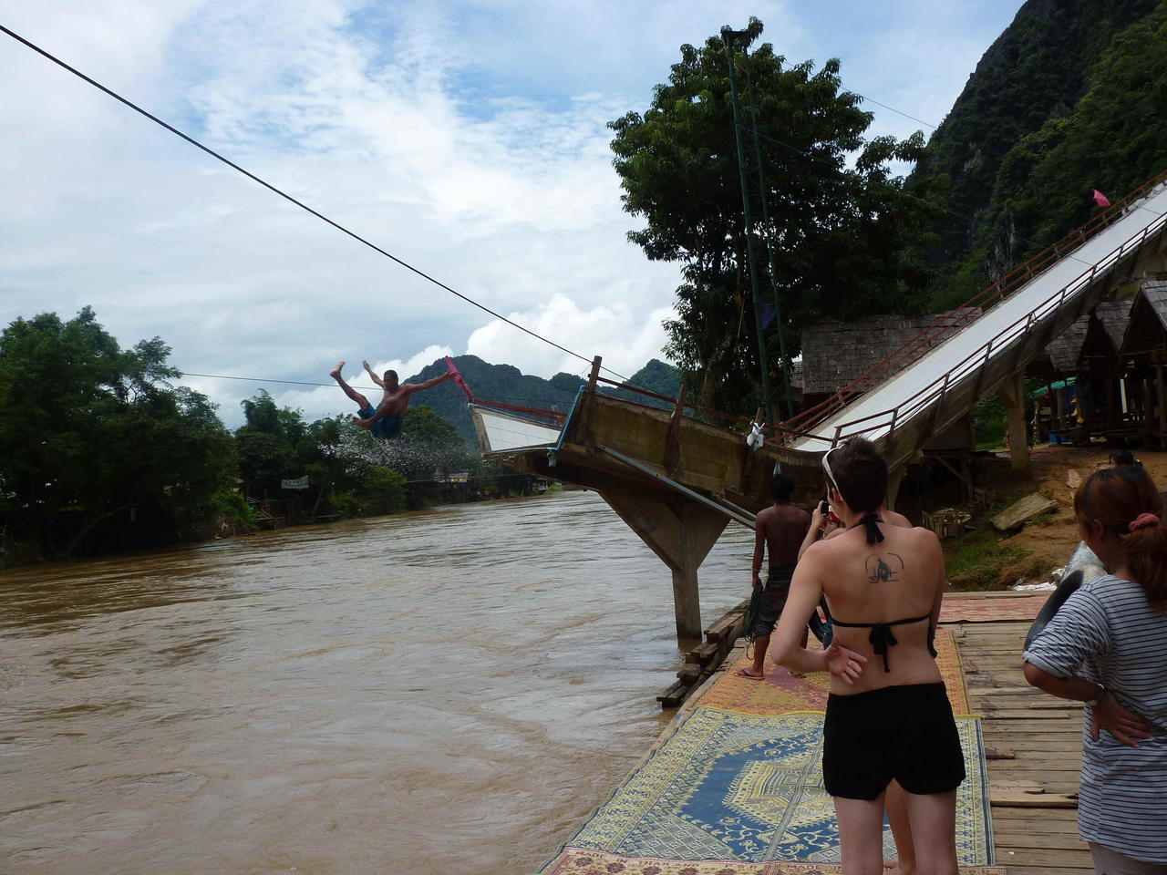 Man nehme einen alten LKW Schlauch, den Fluss und jede Menge Bars am Ufer Ich hatte nicht an allen Bars einen Stopp eingelegt. Ich hielt mich nur an einer Bar mit einer selbst in die Landschaft zementierten Wasserrutsche etwas laenger auf, war dann also gegen 14:30 Uhr schon wieder in Vang Vieng. Da die Stroemung durch die Regenzeit auch wirklich recht stark war. Daher charterte ich mir ein TukTuk um nochmal von vorne zu beginnen