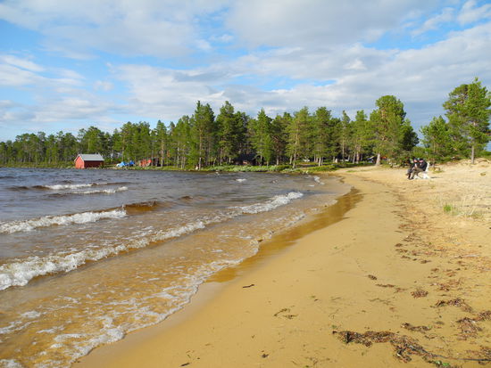 Kurz hinter einer Landzunge am Eingang des Bärenfjordes wurden wir fündig. Ein herrlicher Sandstand, gut 15 Meter breit, erschien uns ideal.