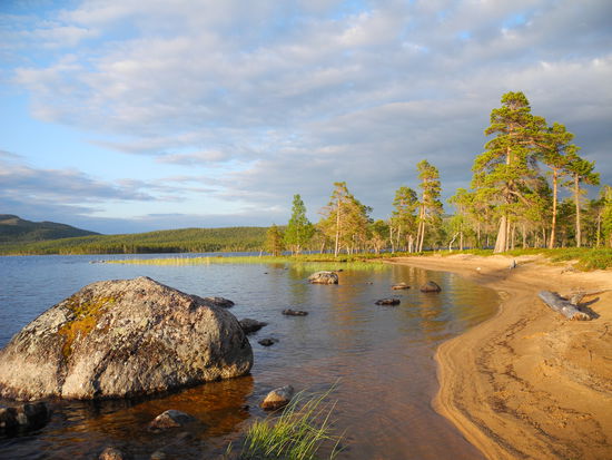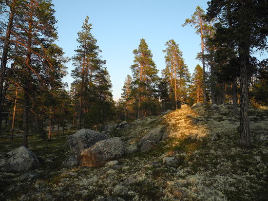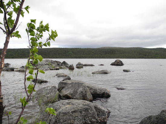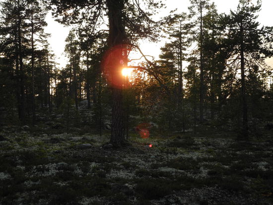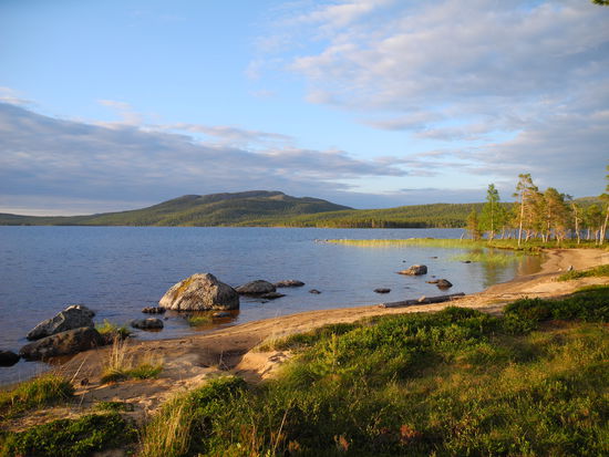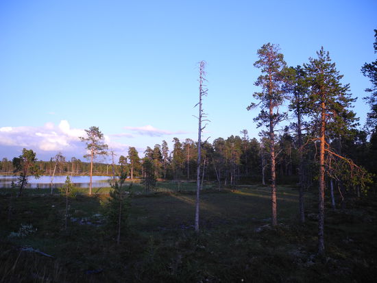 Erst jetzt wurde uns richtig bewusst, wie schön es hier war. Ein herrlicher Ausblick auf den See und die umliegenden Berge , hinter uns ein großes Feuchtgebiet mit lichtem Wald. Einen schöneren Lagerplatz konnten wir uns nicht vorstellen. Als nun auch noch die Mitternachtssonne alles in einem goldenen Licht erstrahlen ließ, war das schlechte Wetter der vergangenen Tage schnell vergessen.