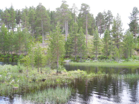 Bis zur schwedisch-norwegischen Grenze waren es nur einige Kilometer. Kurz hinter Eda überquerten wir dann die Grenze zu Norwegen. Auf der gleichen Straße, die auf der norwegischen Seite als zunächst als Bundesstraße 2 bezeichnet wird und dann in die Bundesstraße 20 übergeht, fuhren wir über Kongsvinger bis nach Elverum. Da wir nun schon mehrere Stunden unterwegs waren legten wir eine Pause ein. Der Magen machte zwischenzeitlich auch durch nicht überhörbares Knurren auf sich aufmerksam. Also an einem Geldautomat kurz mit norwegischen Kronen versorgt und ab zum nächsten Imbiss. Mit meinem Englisch kam ich hier nicht so weit wie in Schweden, aber mit Händen und Füßen machten wir der jungen Dame hinter dem Tresen klar, was wir etwas essen wollten. Frisch gestärkt machten wir uns wieder auf, unserem eigentlichen Ziel, dem Femundsee entgegen. Auf einem Parkplatz an einem kleinen See mussten wir nach kurzer Zeit wieder anhalten, da mal wieder einer die Nähe eines Baumes aufsuchen musste.