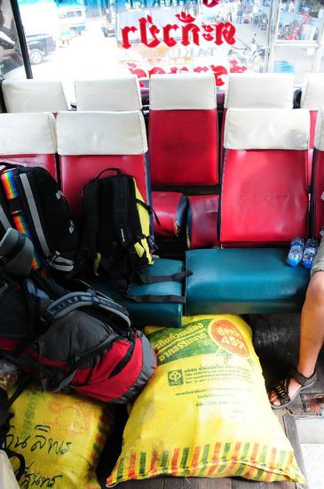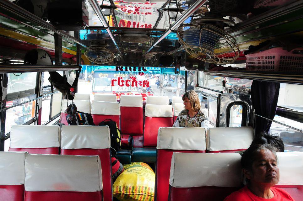 Nach unserem letzten Frühstück bei Noi wurden wir zur Bushaltestelle an die Hauptstrasse gebracht. Eigentlich wollten wir mit dem AC-Bus bis Phuket fahren. Aber auf einmal kam ein bunter alter Bus an, der auch dorthin fuhr. Kurzentschlossen sind wir eingestiegen. AC bestand aus offenen Fenstern und Türen, bei längeren Halts wurden die in der Decke befindlichen Ventilatoren eingeschaltet. Hardy sass auf der letzten Bank, die Beine hatte er auf einem Sack mit Maiskolben liegen, unter dem Sitz vor mir waren die Toilettenartikel des Busfahrers abgestellt. Die Fahrt war urig. An Punkten, die für uns nicht als Haltestelle erkennbar waren, wurde gestoppt, ein- oder ausgestiegen. Irgendwann, irgendwo wurde der Sack mit Mais am Strassenrand abgelegt. Als Postauto fungieren solche Busse ebenfalls, denn auch eine Postsendung wurde entgegen genommen. Nach einer Pause waren wir nach knapp 5 Stunden und 260 THB Fahrtkosten für 2 Personen endlich in Phuket angekommen.