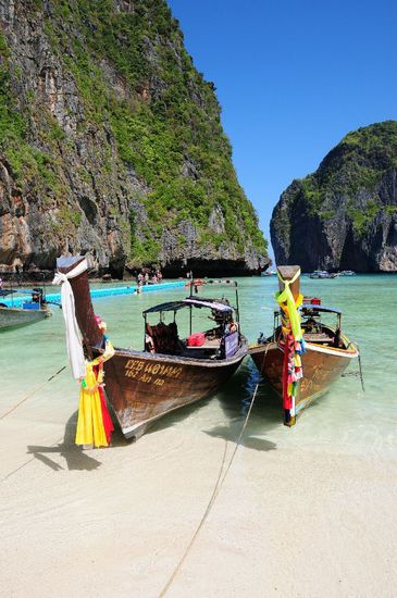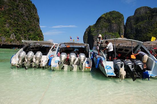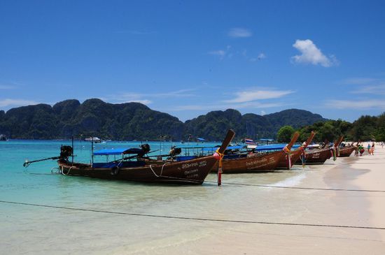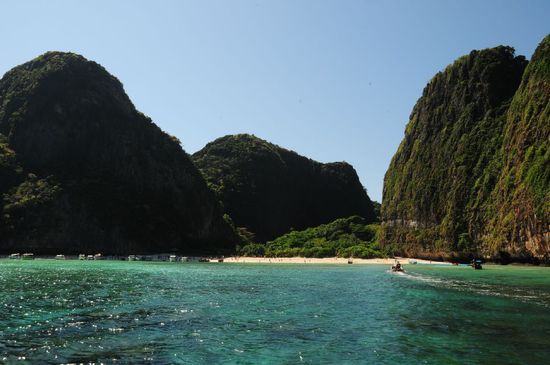 In unserem Hotel hatten wir eine Tagestour zur Maya-Bay, Phi Phi Inseln, bekannt geworden durch den Film "The Beach", mit Leonardo di Caprio, gebucht. Eine Stunde Bootsfahrt mit einem Speedboot, angetrieben von 3 x 225 PS Motoren. Sehr schöne Bucht, aber Menschen über Menschen und Boote über Boote. Danach ein Schnorchelstopp und weiter zu Phi Phi Don zum Lunch. Bei einer dort liegenden Bungalowanlage gab es direkt am Sandstrand ein reichhaltiges Mittagsmenu.