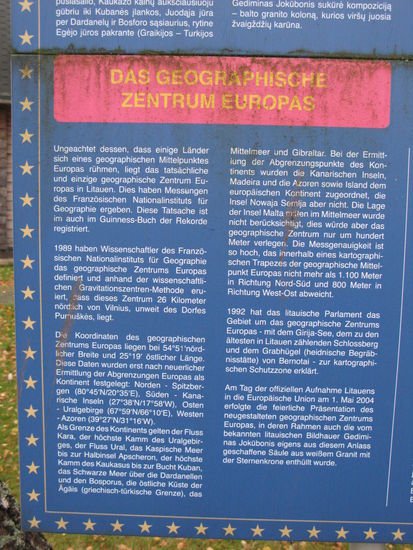 Bis 1989 lag der geografische Mittelpunkt Europas in Raniv, Ukraine - festgestellt 1887 vom "K.u.K. Militärgeografischen Institut" in Wien. Erst dann hat das französische Geografie-Institut mittels Computer das neue geografische Zentrum bestimmt.