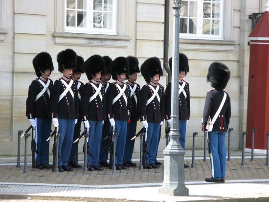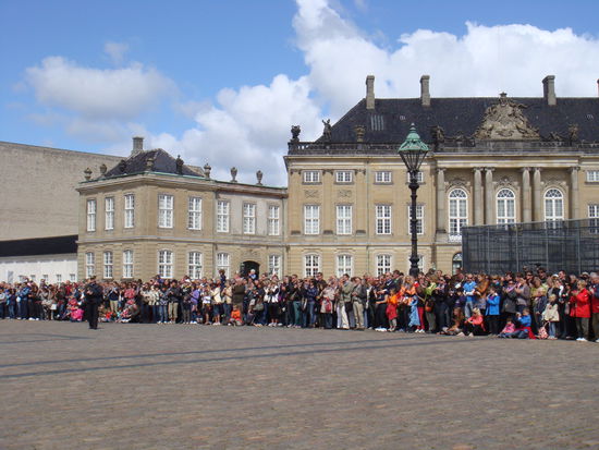 Trotzdem - wir schaffen es, pünktlich um 12 bei der Amalienborg mit etlichen Zuschauern der Wachtablösung zuzusehen...