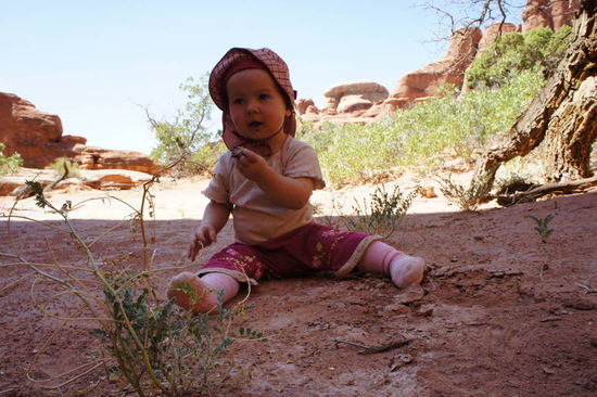Wir überlegten hin und her was wir heute machen werden, ich wollte gern zu den Windows und Kai war noch unschlüssig. Letztendlich wurde es dann eine etwas abgelegenere Geschichte, der Tower Arch. Das war ein schweißtreibender kurzer Trail der es allerdings in sich hatte - eine langgezogene Ebene ohne Schatten und dann eine heiße steil ansteigende Sanddüne in der schön die Füße versanken. Die Tortur lohnte sich, denn der Arch war traumhaft schön und malerisch gelegen. Den Marching Man, den man auf diesem Trail sehen sollte, haben wir leider nicht erblickt. Beim Zurückkehren zum Auto erlebten wir eine böse Überraschung - einen Strafzettel vom Ranger. Wir wussten allerdings nicht wieso, denn der Weg zum Arch war eine offizielle Route und wir hatten nichts Verbotenes getan. Hannes brachte uns dann auf die Idee mal das Nummernschild anzuschauen, und tatsächlich, die hatten uns ein Auto mit abgelaufener Plakette angedreht. Na toll, wir wussten jetzt nicht was der Strafzettel für uns bedeuten würde, wollten uns aber bei dem nächsten Ranger schlau machen. Dann ging es zurück und auf dem Weg zum Picknickplatz kamen uns Hannes und Lara entgegen und wir verabredeten uns für abends zum Sonnenuntergang am Delicate Arch. Nach einem kurzen Picknick ging es dann Richtung Parkplatz vom Delicate Arch. Den Abendbrei haben wir schnell noch vor dem Trail angerührt und wollten die Zwerge dann gleich oben am Arch füttern. Der Weg hinauf führte über eine lange Felsplatte 1 mi nach oben und über geschwungene Felsterrassen weiter. Die Umgebung war echt klasse, fein geschwungene Sandsteinbänder und versteckte kleine Arches. Dann sahen wir etwas was aussah wie Dinosaurierspuren, was gut möglich war, da hier auch Funde gemacht wurden. Auf dem Weg nach oben wurden wir wieder bewundert was für "brave Guys" wir doch sind. Hannes und Lara hatten uns von weitem fotografiert und beobachten können wie wir immer wieder angesprochen wurden. Die Zwillinge sind echte Publikumsmagnete und man kommt immer mit Leuten ins Gespräch. Als wir um die letzte Ecke bogen, sahen wir den schönsten aller Arches. Beschreibungen und auch Fotos können das gar nicht wiedergeben. Einmalig stand er allein und von keinem Felsen umbaut da und unter ihm erstreckte sich eine tiefe Mulde die aussah wie ein Atrium. Von der Abendsonne beschienen glänzte er in Feuerrot und es war einfach atemberaubend. Naja mal von den lustigen Touris abgesehen die unbedingt unter dem Bogen fotografiert werden wollten und die dümmsten Posen und Sprünge machten. Es gab kaum einen Moment wo nicht irgendjemand darunter stand. Wir gönnten den Kindern nach dem Abendbrot noch ein bisschen Kraxelei bevor wir uns wieder auf dem Weg nach unten machten. Hannes und Lara blieben noch ein bisschen und wir verabredeten uns zu Feuer und kaltem Bier (hier in der Hitze alles andere als selbstverständlich) auf dem Campground. Wieder hatten wir einen ereignisreichen Tag mit vielen Meilen in den Beinen hinter uns. Nach einer kleinen Katzenwäsche bei den Kindern wurde es noch ein gemütlicher Abend am Lagerfeuer mit Bacon, Maiskolben und Bier. Mit einem weinenden Auge verabschiedeten wir uns vom bisher schönsten Ziel unserer Reise und blickten mit einem lachenden Auge auf die kommenden Ereignisse. Der morgige Tag war mal wieder nicht geplant und wir wollten uns bei einem Frühstück im Diner entschließen.
