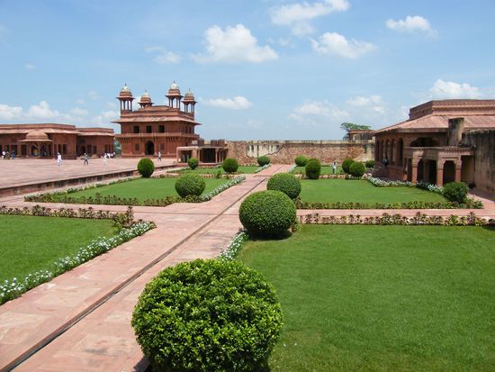 Ca. 40 km vor Agra liegt noch die verlassene Stadt Fatehpur Sikri. Die Stadt wurde 1571 begonnen zu bauen, allerdings wurde sie auch schon 15 Jahre später wieder aufgegeben, aus Wassermangel. Aber was da in 15 Jahren aufgebaut wurde ist schon unglaublich. Riesig und wirklich schön gelegen. Nachdem wir die aber Trillionen Guides wieder hinter uns gelassen haben, haben wir die Tour schnell so gemacht. Uns macht es einfach mehr Spass so. Auf dem höchsten Punkt dieses Hügels wurde die Moschee errichtet. Wir sind da also hoch und haben uns schon gewundert, warum da so viele Menschen rumdüsen. Aber unser Bisht hatte uns ja heute früh erzählt, dass bei den Moslems heute das Fasten zu Ende gegangen ist und heute grosse Party überall angesagt ist.... Ahhhhh... darum so viele Menschen. Da es heute ganz besonders heiss war, haben wir uns unseren nackten Füsse auf dem, quasi, glühenden Fussboden ziemlich angesengt, ohne Quatsch. Egal, Moschee war ganz nett anzusehen. Aber die Menge an Menschen die ständig um einen rum ist, ist einfach erdrückend. Selbst Benita meint, damals hat sie nicht so viele Menschen wahrgenommen. Nach kurzer Zeit wieder raus da und nix wie weg Richtung Agra, denn das war ja unser Hauptziel. Untergebracht sind wir im Hotel Maya. Super nettes Zimmer, wie übrigens alle Zimmer, die wir auf dieser Reise hatten.