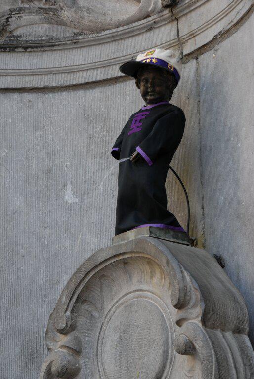Gegenüber setzen wir uns auf einen guten Kaffee hin und beobachten die Menschenmassen vor dem Manneken... Dieser kleine Kerl hat ca. 800 verschiedene Kostüme, die in einem Museum am Grote Markt ausgestellt sind.