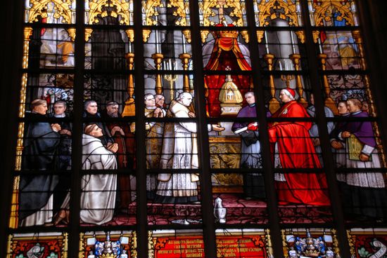 Weiter durch den PARC DE BRUXELLES zum PALAIS DER NATIE und anschließend noch zur SINT-MICHIELS EN SINT-GOEDELEKATHEDRAAL (Hl. Michael und hl. Gudula), der Nationalkirche Belgiens. Die Bauarbeiten dauerten ca. 300 Jahre, aber dieser gotische Bau ist absolut sehenswert. Das Innere der Kathedrale ist recht schlicht, fast kahl, aber ich hab` noch nie so schöne Bleiglasfenster gesehen!