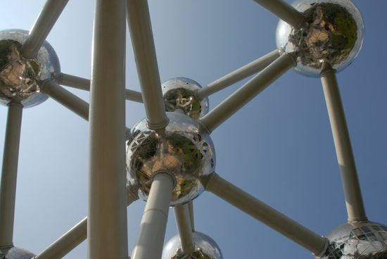 Es wurde anlässlich der Weltausstellung gebaut und stellt ein 165 Milliarden Mal vergrößertes Eisenkristall dar. Dort müssen wir beim Lift endlos anstehen und vorher wird man durch die unteren Kugeln geschleust wo sich eine permanente Ausstellung der Expo 58 befindet. Oben angekommen werden wir durch den grandiosen Rundblick entschädigt. Dort genießen wir ein Glas Wein und ein Bier (€ 9,50 mit Höhenzuschlag) vor dem Fenster. Sitzen tut gut...