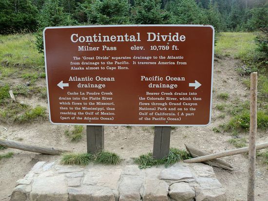 Kaum hatten wir ein Schild mit der Warnung vor sich schnell ändernden Wetterbedingungen passiert, zeigten sich auch schon die ersten dunklen Wolken am Himmel. Noch hatten wir es um die 82 Fahrenheit, aber dies sollte sich schnell ändern. Am Millner Pass hörten wir dann das erste Donnergrollen und Regen und Hagel setzten ein. Dennoch musste natürlich noch schnell ein Foto vom Continental Divide gemacht werden. Hier entscheidet sich, ob Wasser in den Atlantik oder den Pazifik fließt.