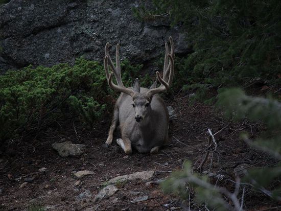 Die Temperaturen fielen zusehends und am Alpine Visitor Center auf 3595 Metern angekommen hatten wir es gerade mal noch 7 Grad. Dazu kam eisiger Wind, Regen und Hagel, so dass es gefühlte 5 Grad waren. Hier trafen wir dann auch auf den ersten tierischen Bewohner des Parks - eine Gruppe von Murmeltieren, und ganz in der Ferne im natürlichen Amphitheater unterhalb des Visitor Centers konnte man auch eine Gruppe Hirsche sehen - leider zu weit weg, um ein vernünftiges Foto zu machen.