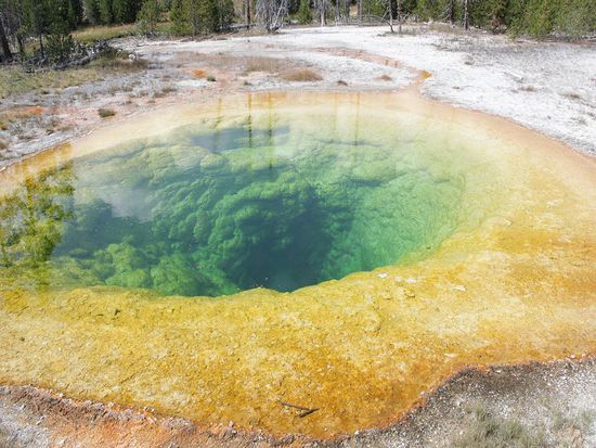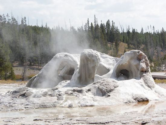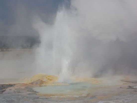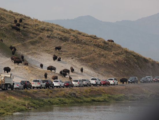Heute haben wir mal wieder mit einer Tour zu den Geysiren und heißen Quellen begonnen. Es gibt davon hier ja ziemlich viele und jeder ist irgendwie anders. Das ganze haben wir dann mal wieder mit einem ausgedehnten Spaziergang verbunden. Überhaupt sind diese Parks ziemlich gut ausgebaut und es gibt unendlich viele trails. Vom Geysir Basin ging es heute in einem Rundkurs Richtung Canyon Village, da dort die Chance auf Wildtiersichtungen groß sein soll. Nun, bevor wir die Tiere sehen konnten, standen wir erstmal im Stau. Aber nicht aufgrund des großen Verkehrsaufkommens oder weil die Leute einfach auf der Straße stehen bleiben und fotografieren (dazu fahren sie zumindest an den Rand). Nein, Grund waren mehrfach die Bisonherden bzw. einzelne Bisons, die meinten, dass das Laufen auf der Straße wohl angenehmer ist, als auf den Wiesen nebenan. Also führten 2 Bisons eine ganze Schlange Autos an, während sie gemächlich ihren Weg auf der Straße fortsetzten. Ein anderer blieb - nachdem die Herde bereits die Stra0e überquert hatte - einfach mal mitten auf der Straße stehen. Ich glaube ja, dass er sich heimlich über die Autofahrer amüsierte. In dem Fall hatte der Bison wirklich gewonnen - vielleicht die heimliche Rache für die Fast-Ausrottung durch Menschenhand. Dieses Erlebnis kann man wohl nur hier haben. Heute haben wir ziemlich große Bison-Herden gesehen. Zum Schluss gab es dann noch mal eine Hirschkuh und einen Hirsch mit Gefolge. Leider war dieser etwas weit weg, um ihn zu fotografieren.