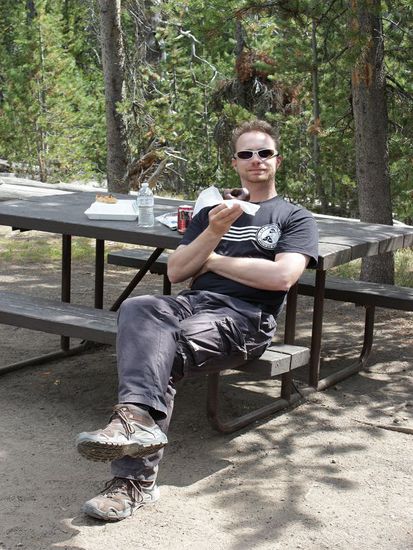 Der Tag fing wieder frisch bei ca. 7 Grad und sonnig an. Heute morgen gab es das erste Mal Bagel mit Creme Cheese. Der erst Bagel nach bereits einer Woche Urlaub! Für den Hunger zwischendurch wurden in der Bakery dann gleich auch noch Donuts gekauft. Ein letztes Mal ging es zu Brian und Paddy, um uns zu verabschieden und noch schnell einen Butterfinger einzustecken. Die zwei Nächte bei ihnen waren wirklich toll und wir können das Alpine Motel in West Yellowstone nur jedem empfehlen.