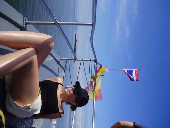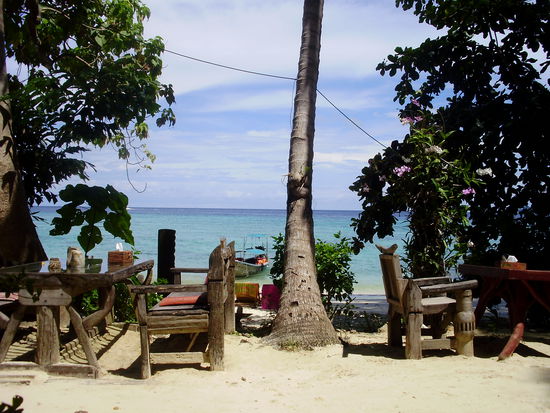 Die Busfahrt nach Krabi war dafuer ganz okay. Der Bus war ziemlich modern und die Strasse super ausgebaut! Um 8 h in der Frueh kamen wir heute dann an und kuemmerten uns direkt um die Faehre nach Kho Phi Phi - dem Ort, an dem "the beach" gedreht wurde. Bei strahlendem Sonnenschein hingen wir anderthalb Stunden auf dem Deck der Faehre und ich holte mir den ersten Sonnenbrand. Gesprochen haben wir dabei nicht viel, da wir so fasziniert von den vielen Kalksteinfelsen mitten im Wasser waren. In Phi Phi angekommen fanden wir nach etwas laengerem Hin und Her dann auch endlich ein Hotel, das nicht direkt am Main Beach liegt, der von Shops und Bars und Auslaendern umsaeumt ist! Hier, im viking village hotel sitzen wir jetzt, haben ein wunderschoenes Bungalow mit Haengematte vor der Tuer und dem allerschoensten Strand, den ich je sah, in Sichtweite.