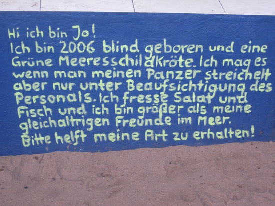 Sie haben eine Schildkröte hier, die blind ist. Als alle anderen vor ihren Geschwistern stolz ins Wasser maschierten hat *Jo* sich nur im Zickzack bewegt. Bei genauerem hinsehen haben sie dann entdeckt das er/sie (unbekannt) keine Augen hat. Da er/sie so nicht überleben könnte wurde ein Becken gebaut. Dies ist schon einige Jahre her und das Becken ist nun zu klein, aber an einer Lösung wird schon gearbeitet.