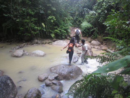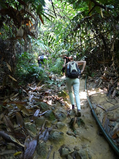 Am nächsten Tag ging es morgens früh los. Wir wurden abgeholt und mussten dann nochmal ne Std in unseren Lieblingsstraßen umher fahren. Nee nee, das gefällt uns nicht. Dann sind wir an einem kleinen Dschungelweg angekommen und wir haben unsere Wanderung gestartet. Der Busfahrer hat unserem Guide nochmal gesagt er soll langsam gehen und er ist los gesprintet. Ich persönlich dachte, es sei ein Weg der insgesamt 2 Std dauert, leider stellte sich aber heraus, dass es je 2 Std. waren. Mist, der Guide ist sooo schnell gegangen, erst bergauf, dann über Flüsse,