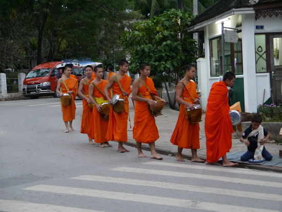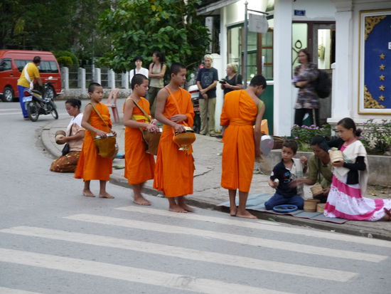 Am nächsten Tag sind wir um 5.00 Uhr aufgestanden und auf die Straße gegangen um uns um 5.30 die Mönche anzuschauen. Es ist hier üblich, dass sie morgens durch die Stadt gehen und somit ihr Essen für den Tag von den Einheimischen zu erhalten. Es wurde extra gesagt, dass wir ihnen nichts geben sollen, denn es ist ja eigentlich mit dem Glauben verbunden, aber da angekommen waren wir schon etwas geschockt. Es sah mega touristisch aus, es wurde uns Reis und auch andere Sachen öfter zum Kauf angeboten (was jetzt gar nicht Sinn der Sache war) und irgendwie etwas enttäuschend, aber natürlich, wenn wir es sehen wollen, wollen es auch die anderen Touris sehen, kann man denen also keinen Vorwurf machen, dass sie versuchen damit Geld zu verdienen.