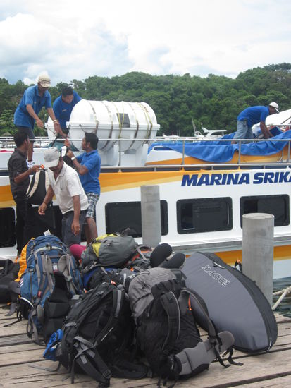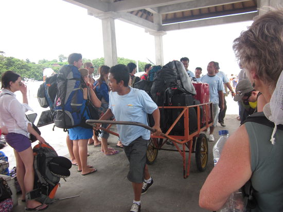 ich hab mich am morgen noch etwas mit meiner Nachbarin verquatscht, als mich der Typ vom Homestay fragte ob ich noch frühstücken will. Klar! Hab ihm auch gesagt das ich heute nach Gili T will. Er so, hmm, nee morgen oder übermorgen geht es wieder! Wenn ich mir aber etwas in den Kopf gesetzt habe will ich es immer ganz bestimmt und sofort. Er kam dann die Treppe hoch und meinte er hat mit seinem Chef gesprochen, ich kann um 11h noch los. Kurzer Blick auf die Uhr: 10.56h!!! ok, kein Streß, alles in den Backpack geschmissen und runter. Die Fahrt mit dem Minivan + übersetzen mit dem Fastboat kostet 250.000 was ca. 20€ entspricht. Ich hatte aber nur noch 150.000 also erstmal nur das bezahlt und der Fahrer war schon mit meinem Rucksack losmaschiert. Etwas fertig im Van angekommen ist mir dann aufgefallen das ich auch noch meinen Zimmerschlüßel in der Tasche hab, naja, dem Fahrer gegeben, in der Hoffnung das er ihn zurück bringt! Hab dann die Leute im Van gefragt wie lange die Fahrt dauert und mich ein wenig erholt. Sind ca. 2 Std über die Insel und 2,5 Std. mit dem Fastboat gefahren und haben dann endlich, im Regen, Gili T erreicht.