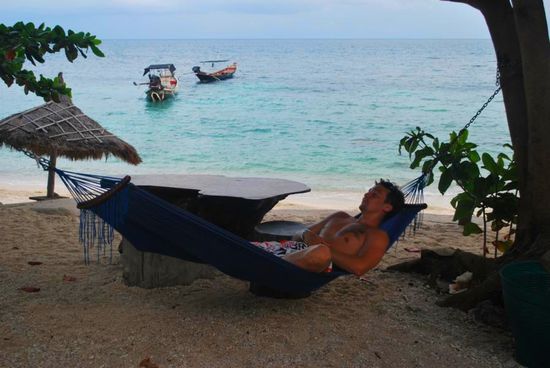 Abends saßen wir in der gemütlichen Bar mit direktem Blick aufs Meer und Shark Island und unterhielten uns mit anderen Gästen des Resorts. Jedes Mal wenn ich mit meinen Krücken angehüpft kam, freuten sich die Thai's, wie gut das nun schon klappte. Wir erfuhren, dass wir nicht die Einzigen waren, die sich auf der Straße zum "Coral View" bereits verletzt hatten. Selbst die Bar-Frau zeigte mir eine Narbe an ihrem Schienbein, die sie nach einer Verletzung durch einen Sturz im letzten Jahr davongetragen hatte.