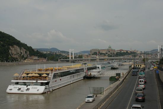Retour auf der linken, hügeligeren Seite Buda: wir sehen das Villenviertel Rosenhügel, die Fischerbastei und den Gellèrtberg (236 m) mit dem St. Gellèrt Denkmal, das an den ersten ungarischen Bischof erinnert (Märtyrertod 1046).