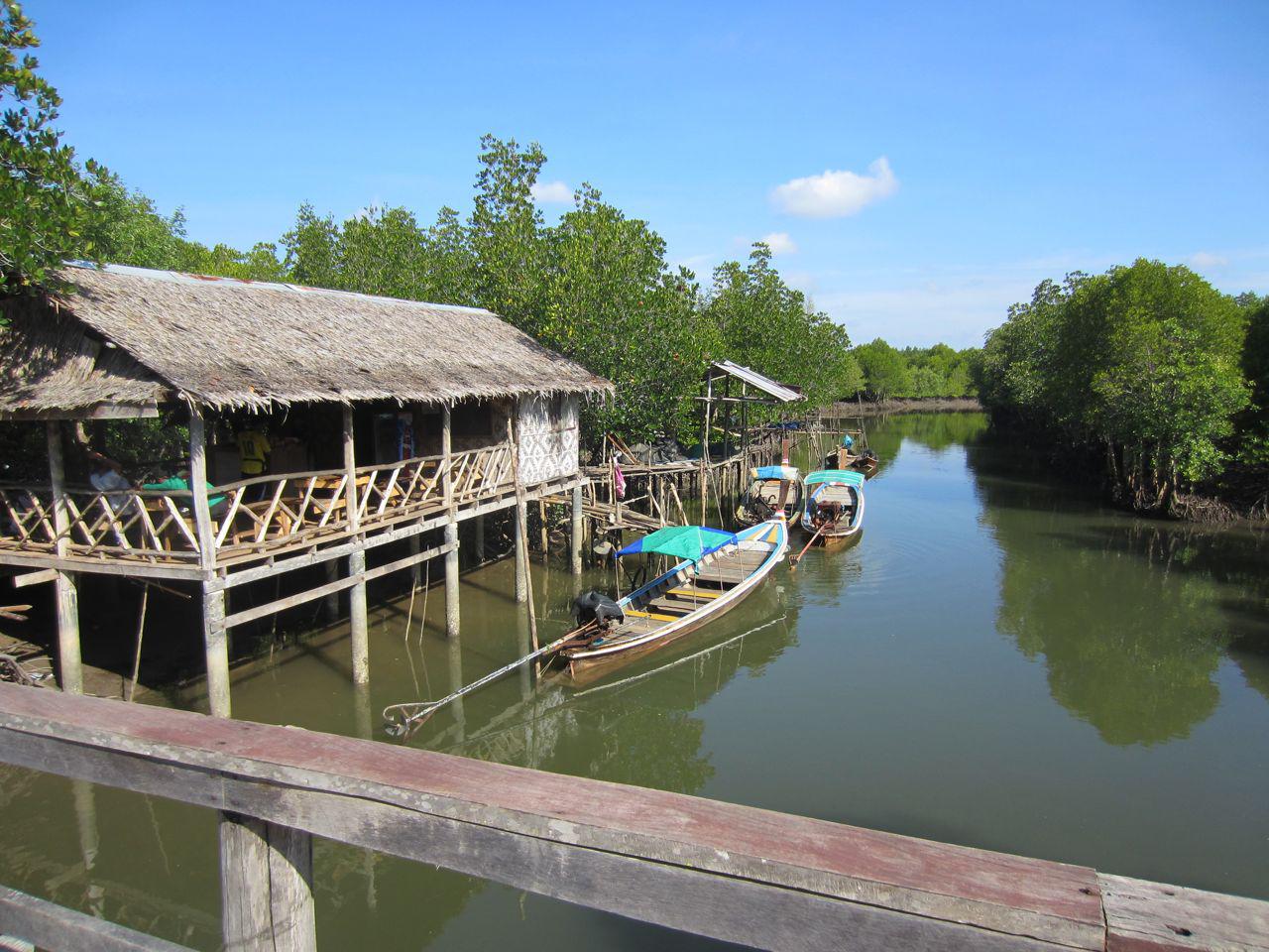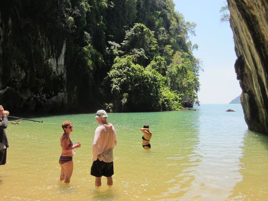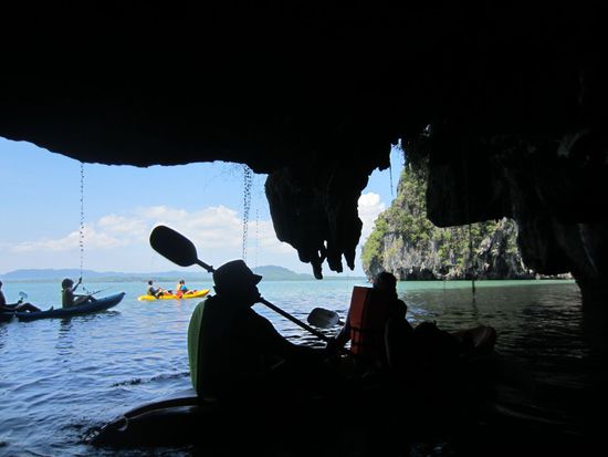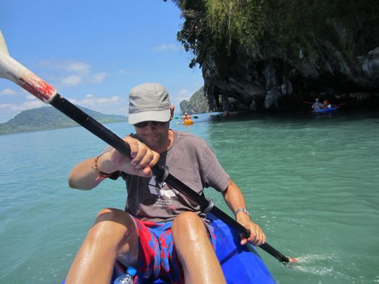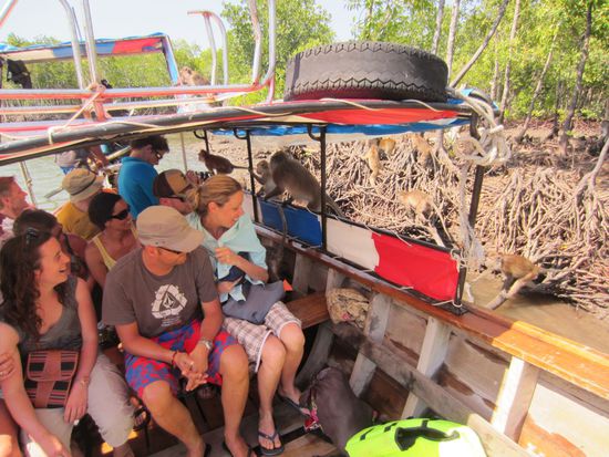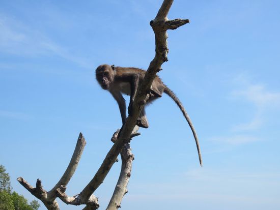 Bei einer Mangroven-Tour mussten wir uns auch mal körperlich betätigen. Kayaking war angesagt, aber bis es dazu kam, dauerte es etwas. Unser Boot machte komische Geräusche, und dann ging auf einmal gar nix mehr. Dann hieß es "Engine is broken!" Hm... Wir trieben dann ca. 30 Minuten auf dem Meer rum, bis sich ein neues Boot fand, mit dem es dann weitergehen konnte. Danach lief dann aber alles planmäßig. Erst Kayaking, dann Lunch und Baden auf der Insel Ko Bu Bu und auf dem Rückweg ging´s noch zur Fütterung bei 2 ortsansässigen Affenfamilien vorbei. Die wussten natürlich was kommt, und hatten blitzschnell unser Boot gestürmt. Füttern konnte man das eigentlich nicht nennen, die haben sich einfach genommen was sie wollten.