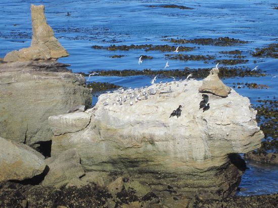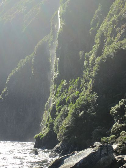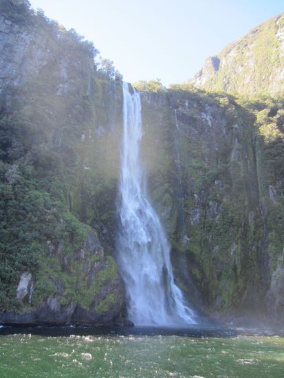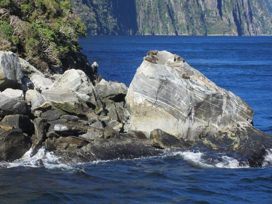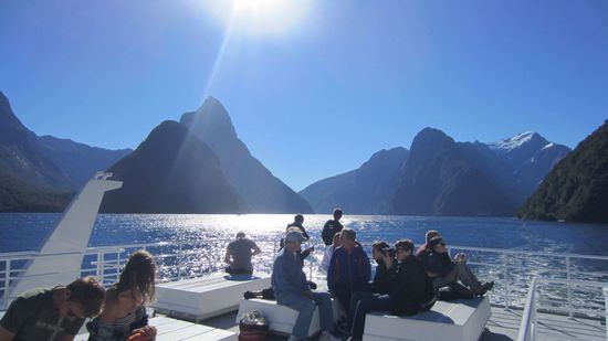 In Akaroa angekommen, haben wir erstmal einen Campingplatz angesteuert und unseren "Horizon" eingerichtet und die technischen Features (Abwasser und Toilette entleeren usw.) gecheckt. Später wurde was Leckeres gekocht und wir haben den Abend entspannt in unseren Klappstühlen mit Blick auf Berge und Meer ausklingen lassen. Voll von den ganzen Eindrücken des Tages sind wir dann völlig seelig in unsere Koje gefallen. Das Örtchen haben wir uns am nächsten Tag angeschaut, bevor es am Nachmittag wieder nach Christchurch ging, um uns mit Volkmar, den wir bislang nur über Telefon und E-Mail kennengelernt hatten, zu treffen, um ein bisschen über Land und Leute zu quatschen. In seinem Büro haben wir zufällig Tina & Moritz kennengelernt, die den gleichen Camper und auch sonst einige Gemeinsamkeiten mit uns haben. Wir hätten Sie eigentlich schon in Südostasien treffen müssen, da Sie in etwa die gleiche Route hatten wie wir, und ebenfalls für ein knappes Jahr unterwegs sind. Wir haben uns auf Anhieb gut verstanden und beschlossen, unser nächstes Ziel "Milford Sound" (Tip von Volkmar, wegen dem Wetter sollten wir direkt dorthin fahren) gemeinsam anzusteuern. Milford Sound ist einer der beeindruckendsten Fjorde in dem südwestlich gelegenen Fjordland der Südinsel. Ist hier so eine Art Weltkulturerbe und als Neuseelandreisender muss man dort gewesen sein. Nach einer Nacht wildcampen an einem Fluß in der Nähe von Christchurch ging es am nächsten Morgen los. Unser Ziel erreichten wir dann 2 Tage später. In der Zwischenzeit haben wir hier und da halt gemacht und diese wunderschöne Natur auf uns wirken lassen. Je näher wir nach Milford Sound kamen, desto abgefahrener wurde die Lanschaft. Die Berge, die teilweise schneebedeckt sind, das Grün der Wälder und das Blau der Seen sind wunderschön! Auch Volkmar hatte Recht behalten und wir erreichten unser Ziel bei strahlendem Sonneschein und spätsommerlichen Temperaturen, obwohl es speziell in Milford Sound 300 Regentage im Jahr haben soll. Aber so ist das halt, wenn Engel reisen... . Dort haben wir dann eine Bootstour durch den Fjord gemacht, wo es u.A. Wasserfälle, Robben und eine sehr imposante Klippenlandschaft zu sehen gab. Genial!