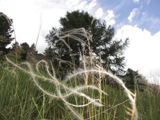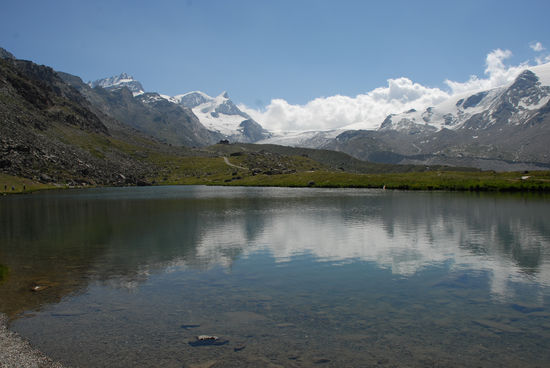 Um 11:15 erreichen wir den Stellisee. Hier rasten wir ein wenig und warten auf Windstille wegen der Seespiegelung. Schaffen wir leider nicht und so gehen wir weiter zum Grindjisee. Da müssen wir leider eine Zeit lang einer befahrbaren Schotterstraße entlanggehen die auch noch dazu voller Touristen ist. Der See selbst liegt aber schön eingebettet in einer lärchenbestandenen Umgebung.