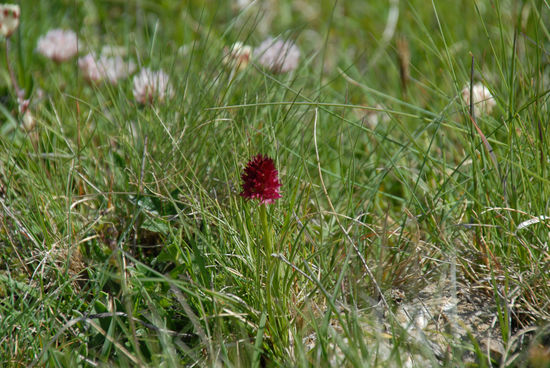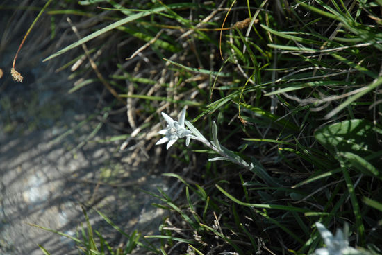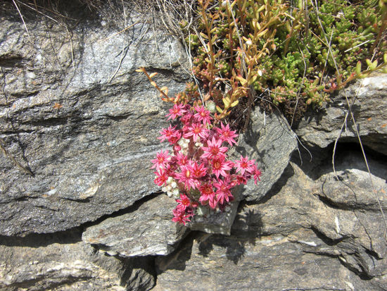 Wir marschieren eine halbe Stunde von Winkelmatten ans andere Ende von Zermatt zur Talstation der Zahnradbahn die uns in nur fünf Minuten rasanter Fahrt nach Blauherd (2571 m) bringt. Dort steigen wir in die Gondel um nach Sunnegga (2288 m). Von Sunnegga aus starten wir gleich mal falsch und marschieren bergauf Richtung Rothorn. Als wir unseren Irrtum merken sind wir schon über eine halbe Stunde unterwegs! (sempern und retour...wir hätten gleich den Japanern nachgehen sollen...). Aber jetzt sind wir richtig und wir werden mit einem wunderschönen Blumenweg belohnt. Vom "Blutströpferl", Hauswurz, Arnika,... bis zum Edelweiß findet man hier alles - ein Paradies für Botaniker.