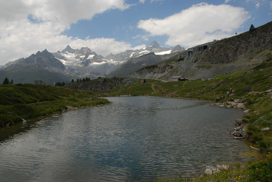 Jetzt müssen wir nur noch ca. 15 - 20 Minuten teilweise sehr steil hinauf über eine Wiese zum Leisee. Auch ein Badesee, aber hier kann man auch sehr viele Murmeltiere beobachten. Gleich oberhalb des Leisees befindet sich wieder die Gondelstation Sunnegga die wir um 15:00 erreichen.