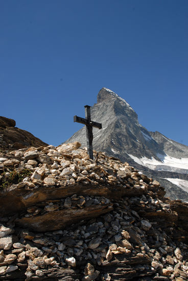 Um 13:00 stehen wir dann vor der Felswand, das "Horu", die letzten 300 Höhenmeter. Dieser Abschnitt müsste eigentlich "Horror" heißen: er ist steil, ausgesetzt, mehr klettern als gehen... Meinhard macht die dünne Luft ein wenig zu schaffen. Mir zuerst auch, aber irgendwann hab` ich so einen Kick bekommen, dass ich nur mehr rauf wollte. Immer unser Ziel, die Hörnlihütte, vor Augen habe ich meinen Mann angetrieben - er hat mir schon zu viele "Fotopausen" gemacht.