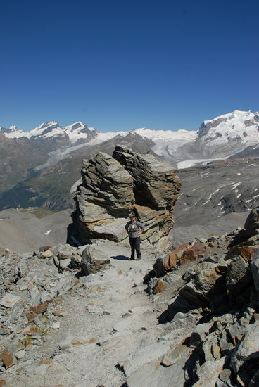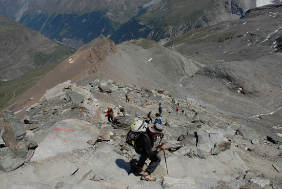 Ein bisschen Genießen noch und dann müssen wir wieder abwärts, weil die letzte Gondel um 17:00 fährt und wir heute sicher nicht noch zwei Stunden länger bis nach Zermatt gehen möchten. Runter brauchen wir 1 h 45 m.