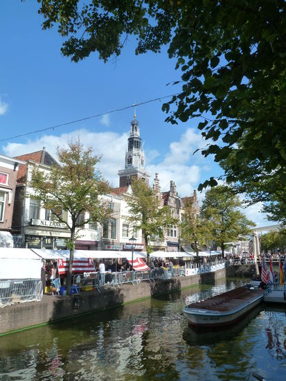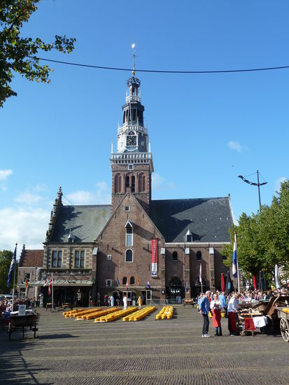An unserem letzten Tag machen wir einen Ausflug zum nicht allzu weit entfernt liegenden Alkmaar - unsere Wohnung ist ja bereits nördlich von Amsterdam. Da heute Freitag ist, starten wir früh um nicht in die Stoßzeiten des berühmten Käsemarkt mit erheblichen Parkproblemen zu geraten, die dann zu erheblichen - in den Niederlanden üblichen - Kosten führen. Wir finden tatsächlich einen kostenfreien Platz und laufen schon mal ein paar hübsche Gassen der Altstadt ab.