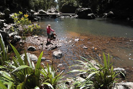 Der erste Anlaufpunkt des Springbrook NP ist die 'Natural Bridge' und nachdem alle ihren Mittagsschlaf im Auto beendet haben, sind wir sogar überrascht von dieser im dichten Rainforst gelegenen Attraktion, die auf einem kurzen Trail erlaufen werden kann. Weiter geht es auf das Hochplateau des Nationalparks. Dort steuern wir nach einigen weiteren kurzen Lookouts den einzigen Zeltplatz an und freuen uns (es ist Samstag und es sind Schulferien), den letzten freien Platz zu sichern. Danach schnell Ernüchterung, beim genaueren Hinsehen erfahren wir, dass es ein pre-booked Platz ist und man nur im Voraus per Internet oder Telefon buchen kann. Ganz prima Sache für Spontan-Touristen aus Übersee. Wir versuchen also von der nächsten Telefonzelle aus diesen einen Platz zu buchen - ist natürlich nicht mehr frei. Das dafür sehr lange und nette Gespräch endet mit einer positiven Bewertung meines Englisch und Buchung des NP-Zeltplatzes im benachbarten Lamington NP für die Folgenacht. Doch was wird nun heute? Noch eine Stunde, bis es dunkel wird, und keine Möglichkeit im NP zu bleiben - so ein Mist.