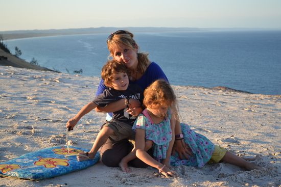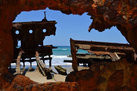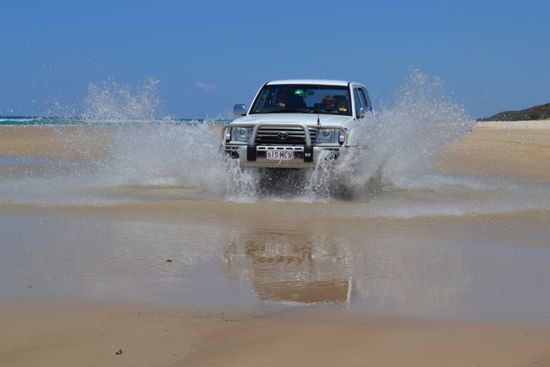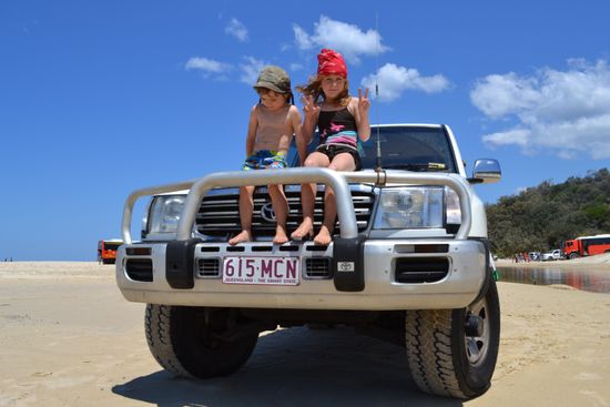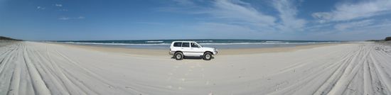 Nach etwas unruhigem Schlaf - ich habe ein bisschen Respekt vor dem eigenen Fahren und den Herausforderungen auf Fraser Island sowie dem straffen Zeitplan der Gezeiten wegen - stehen wir alle noch vor 6Uhr auf, packen zusammen und übernehmen den Toyota Landcruiser gegen 8Uhr. Wir erwischen die 'On Demand' Barge (Autofähre) als letztes Auto um 8:45Uhr und wühlen uns ab 9Uhr durch den Strand der größten Sandinsel der Welt. Zuerst geht es auf einem Inlandtrail von der Südspitze ca. 12km ans Ostufer der Insel und dort die Dünen hinab auf den festen Sand der zurückgehenden Flut. Von nun an kann man mit bis zu 80 km/h gen Norden fegen. Doch Augen auf, ab und zu queren Bachmündungen den Strand - es lauern versteckte Sandabbrüche von bis zu 30cm Höhe. Auf jeden Fall sollte man das Fahren im Salzwasser unterlassen, sonst droht Ärger vom Vermieter! Wir stoppen des Öfteren, machen viele Fotos, befahren die Bäche und erreichen gegen 11Uhr das bekannte, 1935 hier gestrandete, Schiffswrack 'Maheno'. Danach geht es noch zu den Pinnacles - Sandsteinformen ähnlich denen im Bryce Canon, USA - und dann Retour Richtung Süden zum Eli Creek. Hier können die Kiddys kurz planschen und es gibt etwas Mitgebrachtes zu essen.