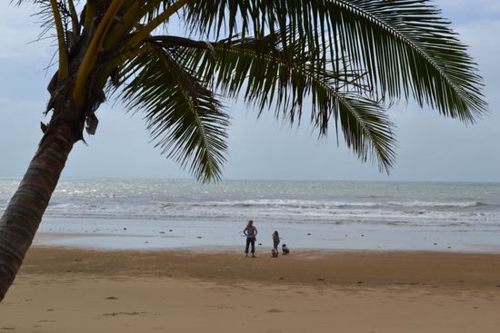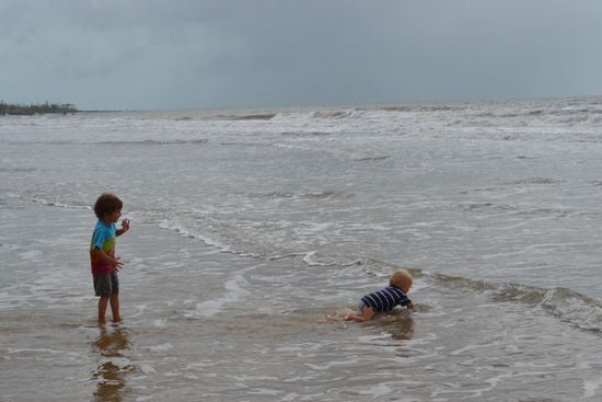 Die Fahrt gen Innisfail wird von vielen Schauern begleitet - kein Wunder, wir durchfahren auch die mit über 4000mm Regen pro Jahr niederschlagsreichste Stadt Queenslands. Wir sind sogar soweit, unser nächstes Ziel, den Misson Beach, aufzugeben, doch dann biege ich trotzdem bei strömendem Regen vom Highway ab und wir fahren die 25km zum Meer. Die Straße säumen Warnschilder, dass hier die seltenen und vom Aussterben bedrohten Cassowary - Emuähnliche Vögel- wild leben, man möge doch bitte mit großer Vorsicht fahren. In Mission Beach gibt es ein paar Restaurants und Shops, Vieles hat geschlossen - wahrscheinlich aufgrund des Wetters - es ist nachvollziehbar. Aber immerhin regnet es gerade nicht. Wir laufen die 150m zum 14km langen Naturstrand - ein palmengesäumter breiter Strand mit feinstem Sand, wenn hier jetzt Badewetter wäre... Jedoch es ist warm und der starke Wind hindert die Kinder nicht daran, sich nach der langen Fahrt im Meer auszutoben. Das Ergebnis ist immer das Gleiche: 'Bitte nur mit den Füßen ins Wasser...' endet damit, dass sie erst dann alle Sachen komplett ausziehen, wenn diese schon pitschnass sind. Auch Matteo nimmt sich darin inzwischen nix mehr mit den Großen. Der Spaß nimmt ein abruptes Ende, als Maya laut schreiend im flachen Wasser sitzend von einer knapp 10cm großen Strandkrabbe in den Finger gezwickt wird. Sie kann erst beruhigt werden, als wir am Auto sind und ein Pflaster den leicht blutenden Finger umhüllt.