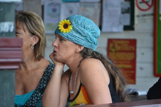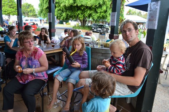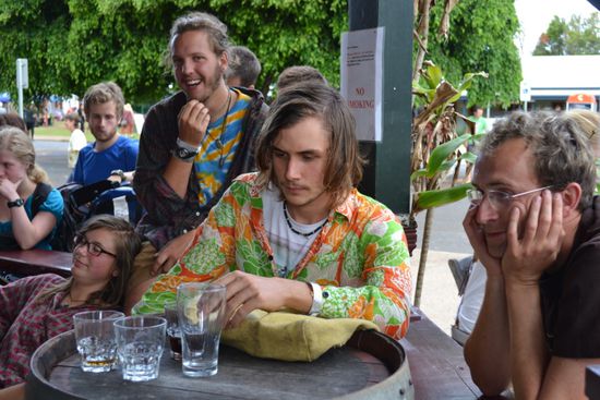 Wir fahren weiter zu den Malanda Falls und danach zum 60m tiefen 'The Crater' im Hypipamee NP, einem kesselartigen Granit-Krater aus längst vergangenen Zeiten. Am wärmstens empfohlenen Lake Eacham gibt es Tomaten-Nudelsuppe und ein kühles Bad im nächsten erloschenen Vukankrater. Danach wollen wir noch eine größere Runde durch die Tablelands gen Cairns fahren, dieses Vorhaben nimmt aber ein jähes Ende, als wir im nahegelegenen Yungaburra -eigentlich nur mal kurz - anhalten. Hier findet seit 2 Tagen das bekannte Yungaburra Folk Festival statt und ich weiß schon nach wenigen Minuten, dass mich hier so schnell keiner mehr weg bekommt. Wir genießen die Live Musik, besonders die von Dorfbewohnern auf der Veranda des Lake Eacham Hotel Gespielte. Von Akkordeon bis zu Kuh-Rippen ist alles im Einsatz, womit man musizieren kann. Auch die Kiddys dürfen fleißig mitmischen und amüsieren damit die Dorfgemeinde und Gäste. Die Hippies sitzen ebenso dabei und unterhalten sich etwas stoned mit uns, im nächsten Zelt geht der Punk ab. So geht die Zeit dahin und wir müssen unseren Erforscher Nevio des Öfteren im Hotel oder auf dem Festgelände suchen bzw. vor größeren Aktionen bewahren.