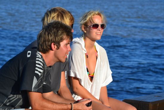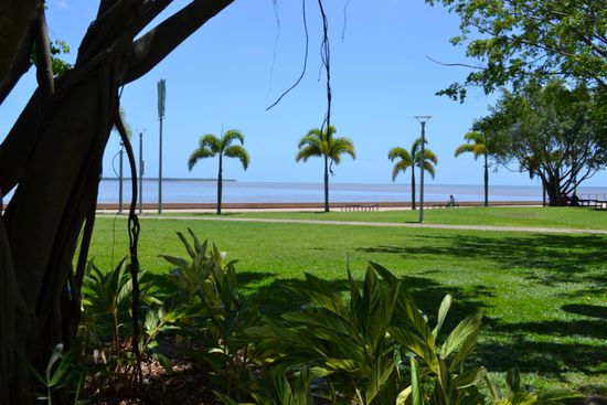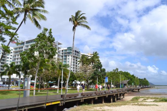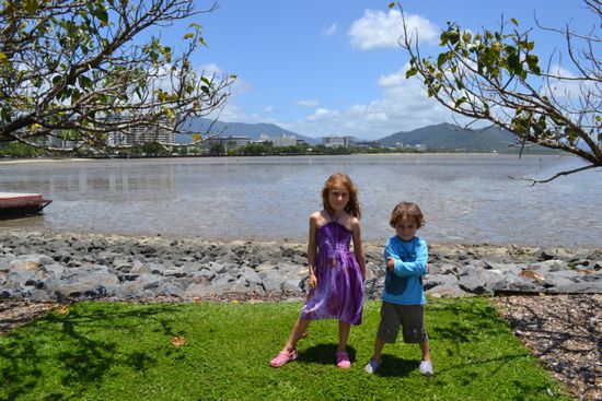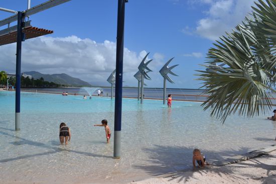Am wechselhaftem Morgen mit Sonne, Nieselregen & Regenbogen starten wir 8Uhr gen Cairns und parken direkt an der Esplanada - der Uferpromenade der Stadt. Wir beladen den Buggy und laufen in Richtung Hafen. Unterwegs begegnen wir wieder vielen Sportlern, die u.a. die hier installierten Fitnessanlagen nutzen - die Kinder mischen natürlich mit. Als wir an der Lagune, einer 4000qm großen Salzwasser-Badelandschaft umgeben von Parks, ankommen, gibt es für die Kurzen kein Halten mehr. Diese kostenfreie und durch Lifeguards bewachte Anlage wurde vor einigen Jahren hier erbaut, da es in Cairns keinen Stadtstrand gibt, sondern es sich eher um Mangrovenschlamm mit Krokodilpotential handelt. Nach dem Vormittagsbad bei inzwischen Sonnenschein & 33°C erkunden wir den Hafen und laufen eine kurze Runde durch die Stadt, die aber nichts weiter Sehenswertes bietet. Nach dem Mittagessen und letztmaligem Shopping zieht es die Kinder aber wieder zum Pool und so verwerfen wir unser letztes Wunschziel, die Royal Flying Doctors zu besuchen, und verdrängen auch, dass wir ja eigentlich packen müssen, denn der nächste Morgen ist schon Abgabetag des Campervans - wenigstens haben wir mal bei der Vermietstation angerufen... Den restlichen Nachmittag verbringen wir am/im Wasser und Maya macht einen großen Schritt in Richtung Tauch- und Turmspringer-Karriere ;o) Wir haben viel Spaß in den letzten tropischen Stunden, daheim wird es Zeit, sie beim Schwimmkurs anzumelden.